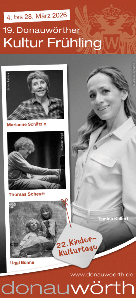 Das traditionelle Neujahrskonzert fungiert als musikalischer Auftakt des neuen Jahres. Die bildenden Künstler der Region stellen ihre aktuellen Arbeiten im Februar bei der „Großen Nordschwäbischen Kunstausstellung“ aus und der „Donauwörther Kultur Frühling“ erwartet Sie nach dem langen Winter mit einem frischen Kulturprogramm. Auch die „Kinder-Kulturage“ sind mittlerweile fester Bestandteil im Kulturleben geworden.